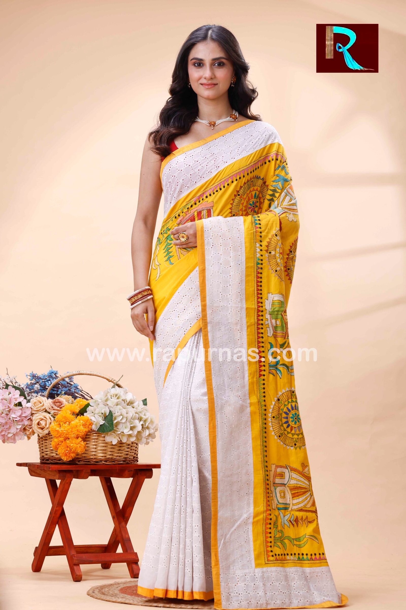 Hakoba Kantha Stitch Saree .The intricate kantha embroidery motifs on the plush silk/cotton texture with charming color redefine the beauty of this saree. This is another gem from the trove of Rapurna’s collection. This ethnic handicraft from Shantiniketan is another creative finesse of Bengal.