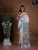 Kantha Stitch Work on Art Silk Saree .The intricate kantha embroidery motifs on the plush silk texture with charming color redefine the beauty of this saree. This is another gem from the trove of Rapurna’s collection. This ethnic handicraft from Shantiniketan is another creative finesse of Bengal.
