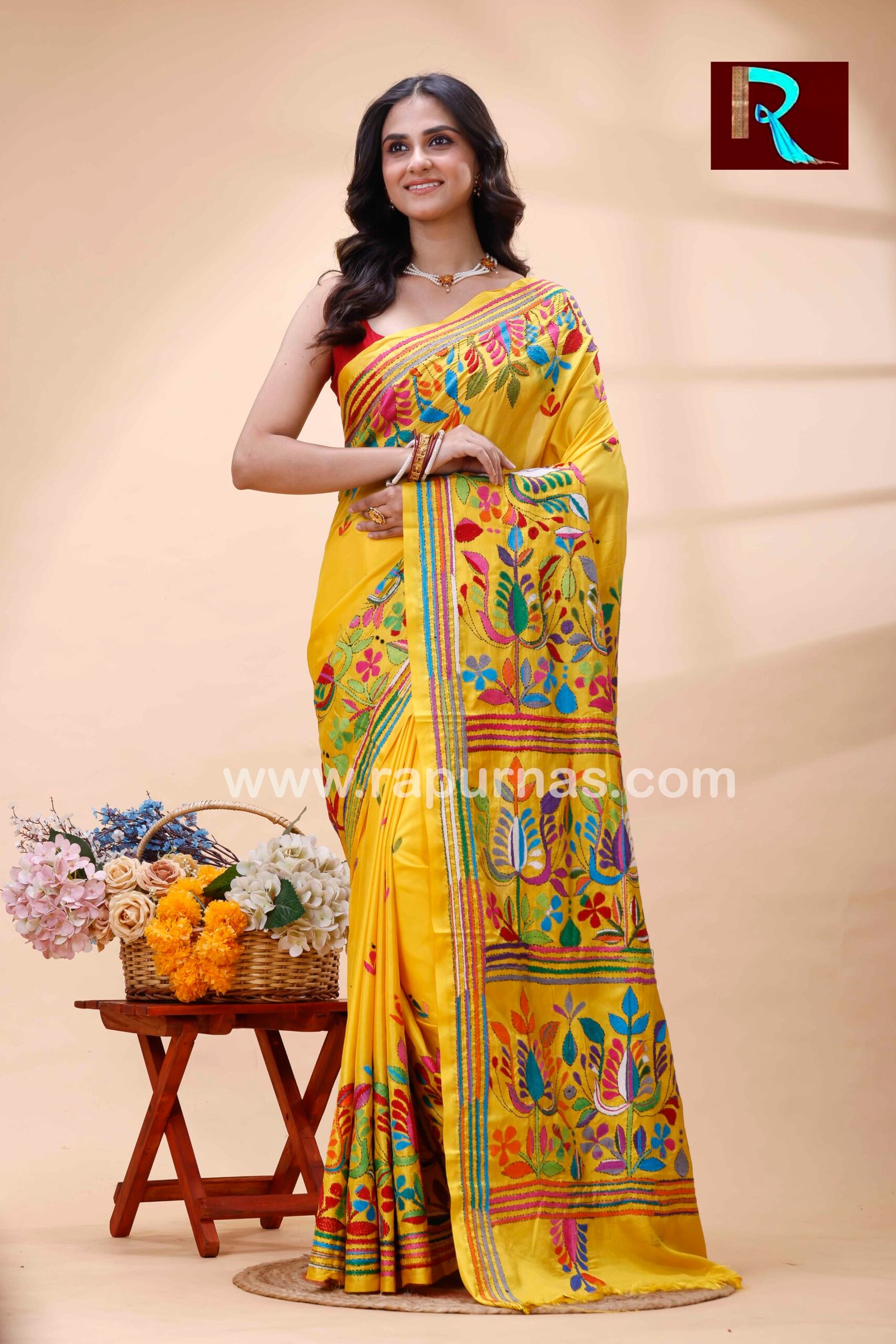 Kantha Stitch Work on Art Silk Saree .The intricate kantha embroidery motifs on the plush silk texture with charming color redefine the beauty of this saree. This is another gem from the trove of Rapurna’s collection. This ethnic handicraft from Shantiniketan is another creative finesse of Bengal.