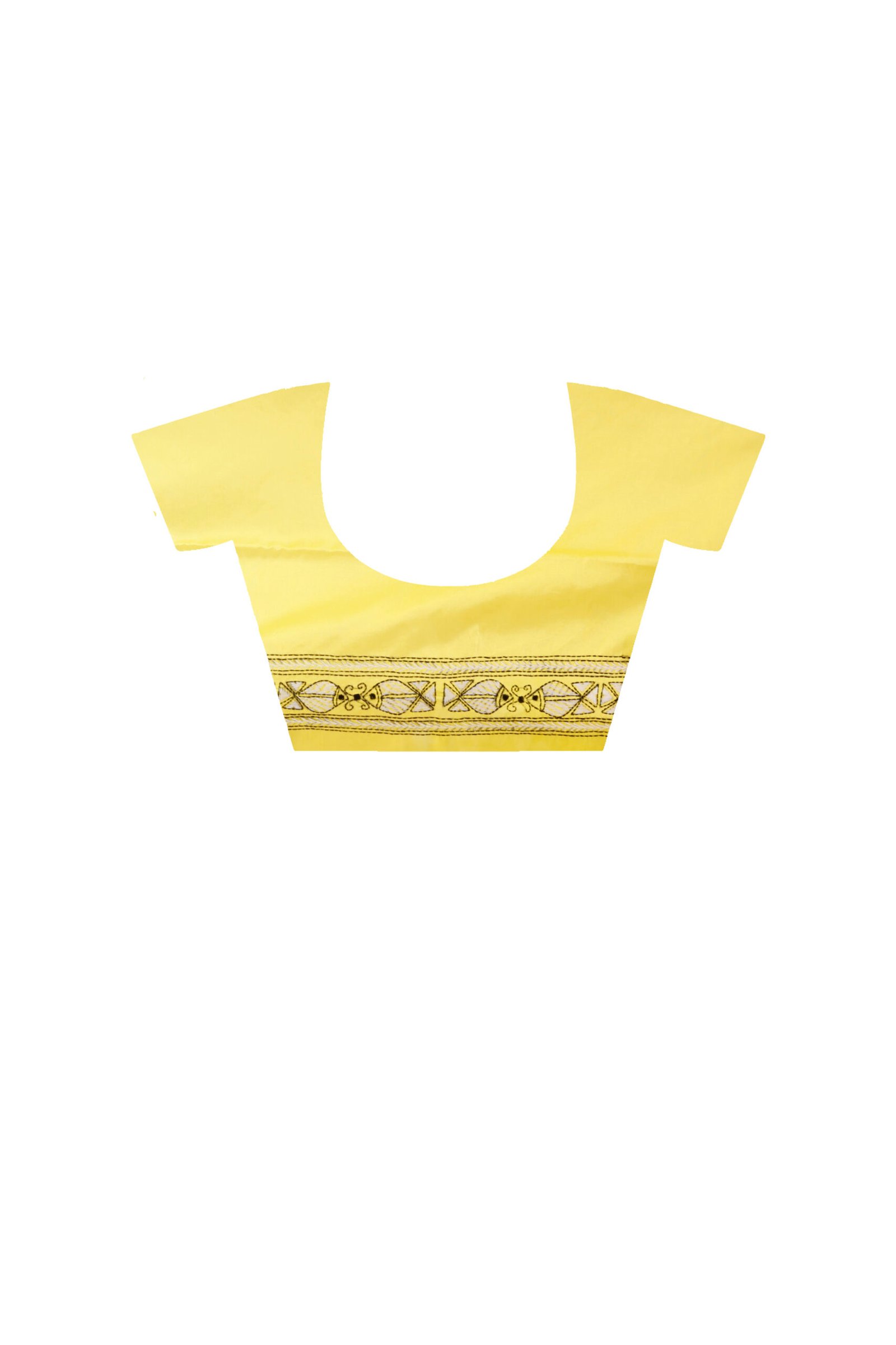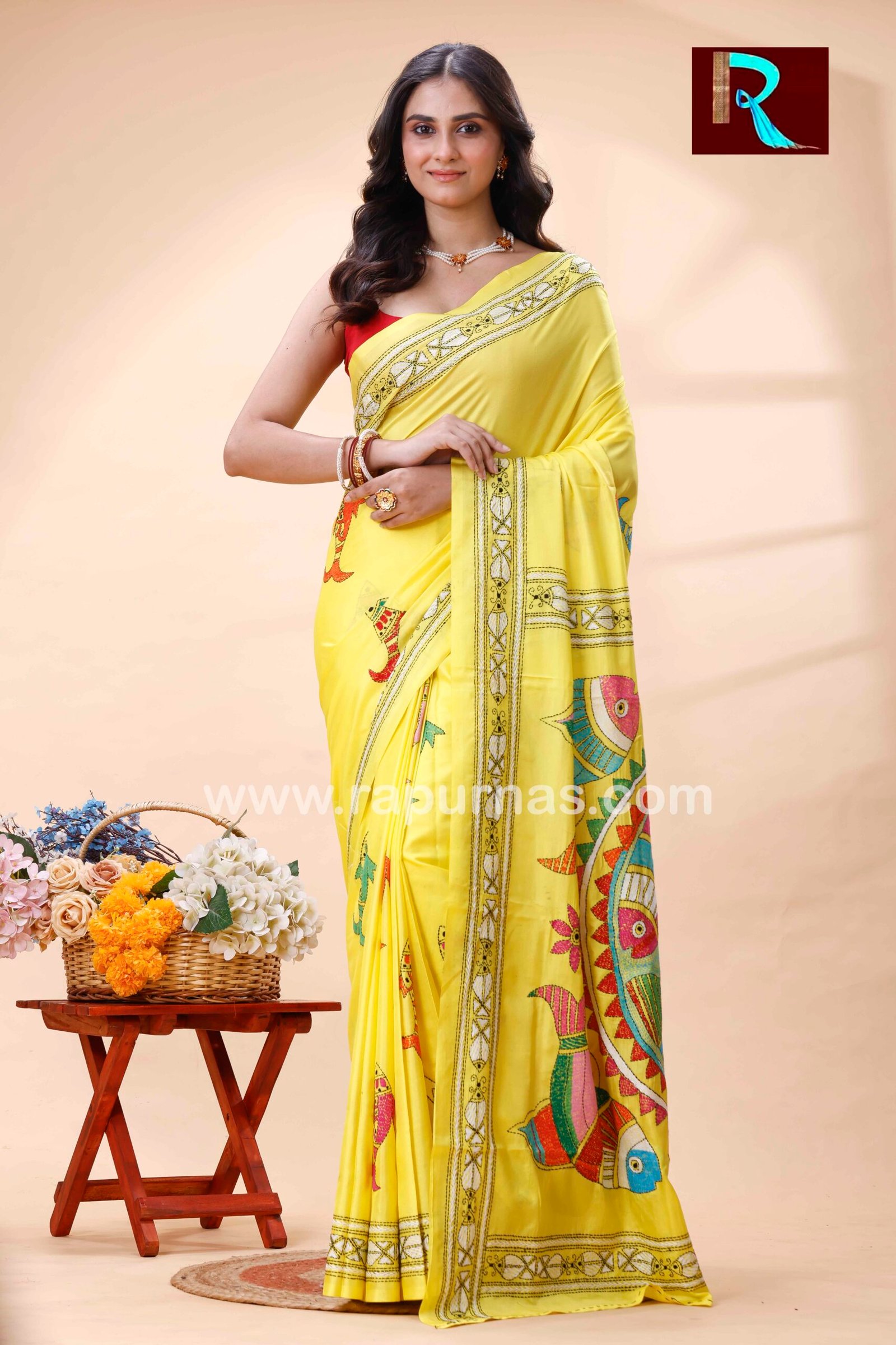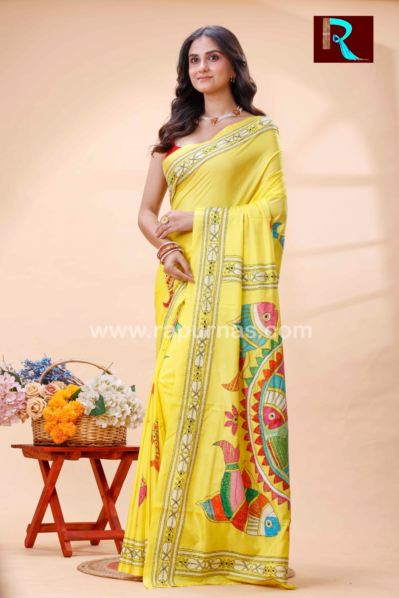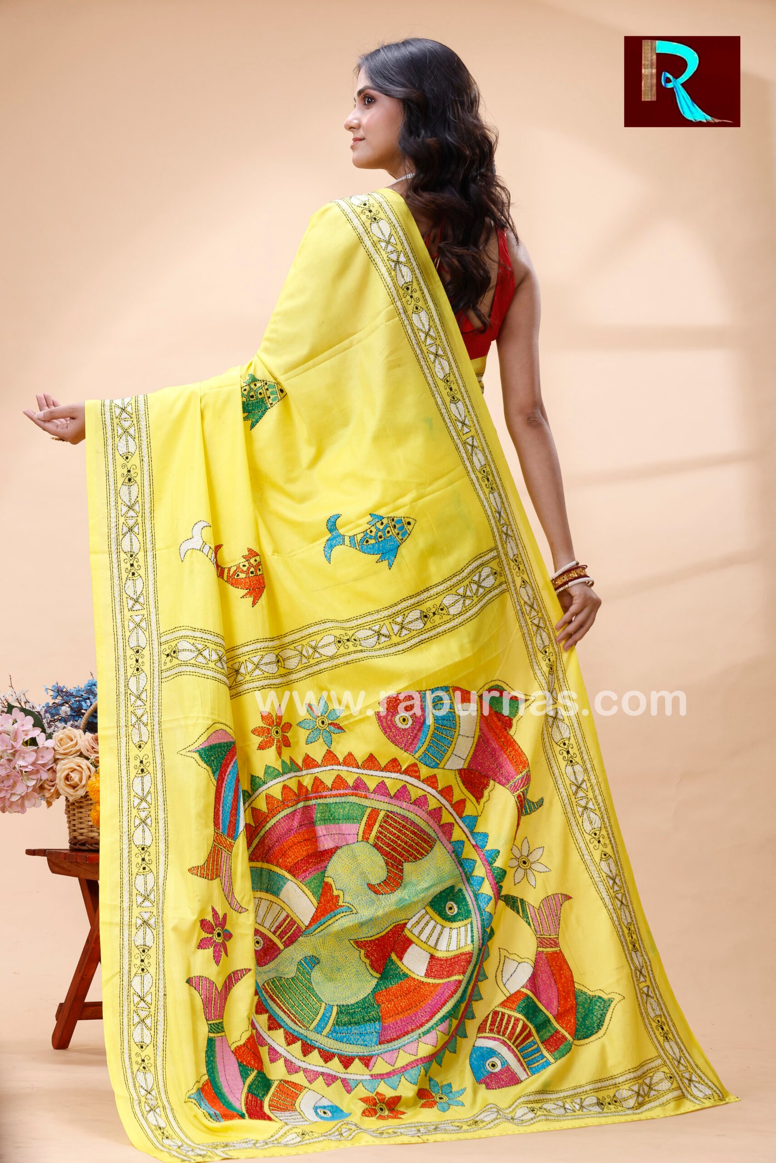 Kantha Stitch Work on Art Silk Saree .The intricate kantha embroidery motifs on the plush silk texture with charming color redefine the beauty of this saree. This is another gem from the trove of Rapurna’s collection. This ethnic handicraft from Shantiniketan is another creative finesse of Bengal.