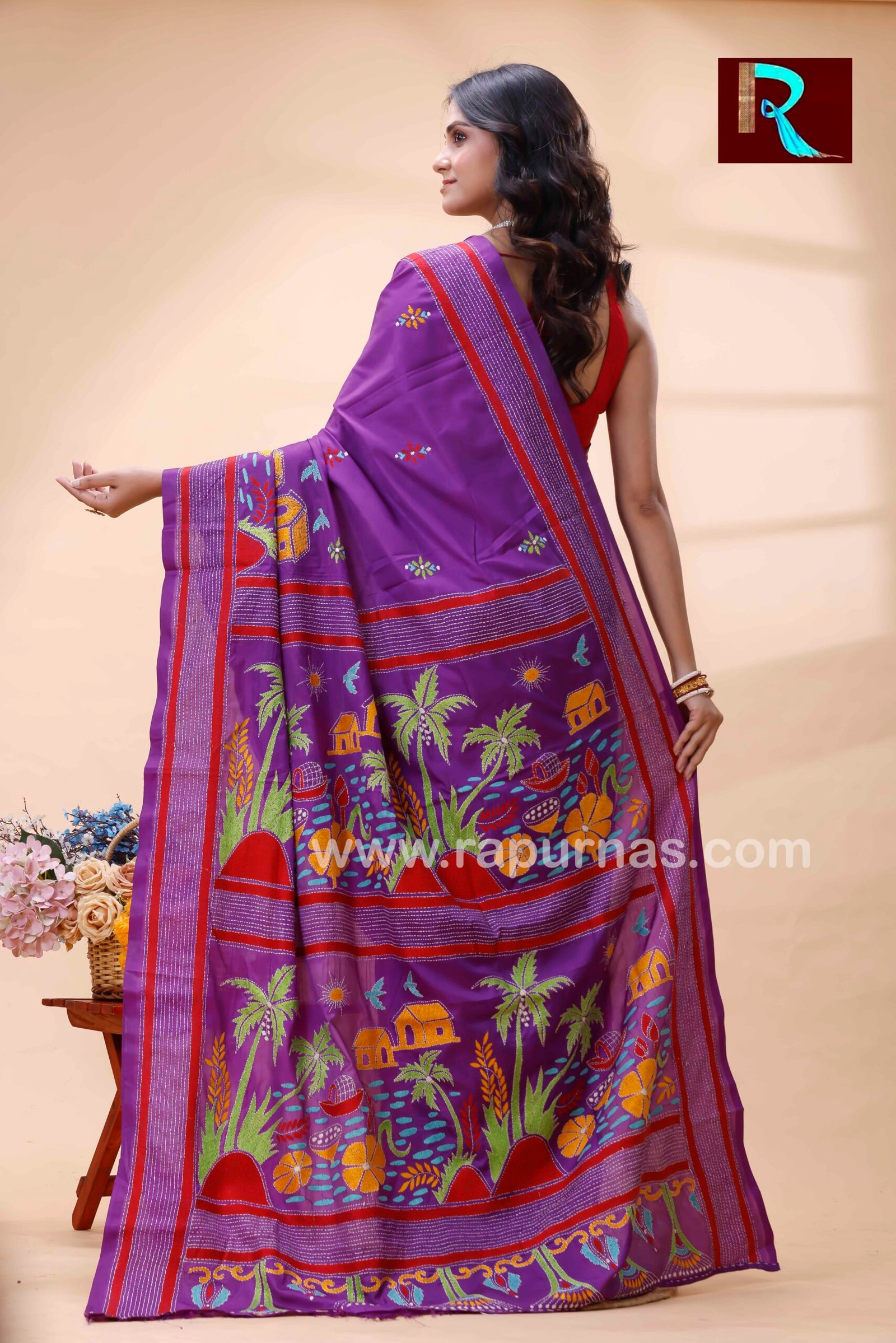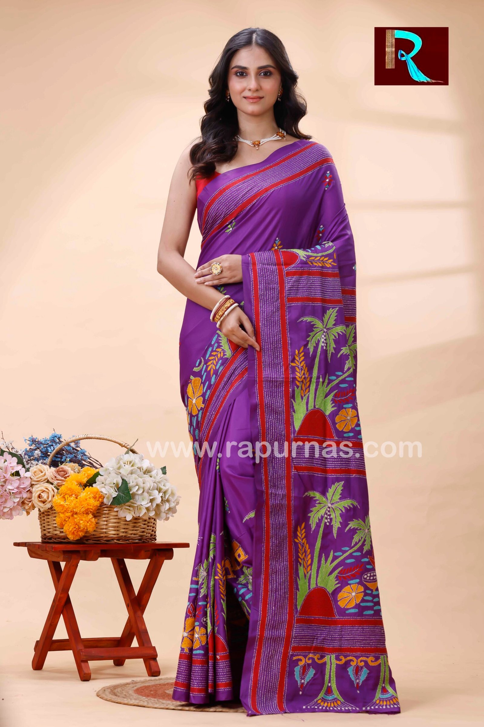 Kantha Stitch Work on Art Silk Saree .The intricate kantha embroidery motifs on the plush silk texture with charming color redefine the beauty of this saree. This is another gem from the trove of Rapurna’s collection. This ethnic handicraft from Shantiniketan is another creative finesse of Bengal.