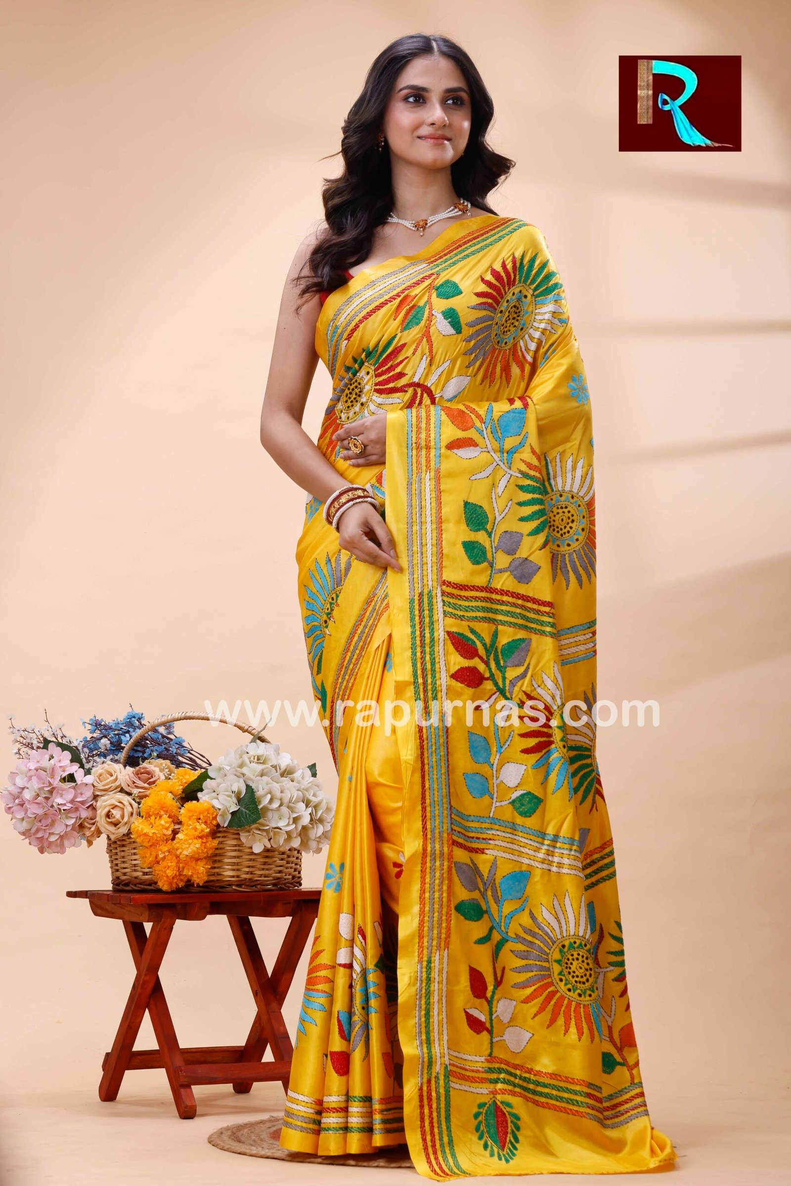 Kantha Stitch Work on Art Silk Saree .The intricate kantha embroidery motifs on the plush silk texture with charming color redefine the beauty of this saree. This is another gem from the trove of Rapurna’s collection. This ethnic handicraft from Shantiniketan is another creative finesse of Bengal.
