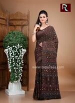 Kantha Stitch Work on Pure Cotton Saree .The intricate kantha embroidery motifs on the plush silk texture with charming color redefine the beauty of this saree. This is another gem from the trove of Rapurna’s collection. This ethnic handicraft from Shantiniketan is another creative finesse of Bengal.