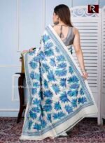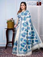 Kantha Stitch Work on Pure Tussar Silk Saree .The intricate kantha embroidery motifs on the plush silk texture with charming color redefine the beauty of this saree. This is another gem from the trove of Rapurna’s collection. This ethnic handicraft from Shantiniketan is another creative finesse of Bengal.