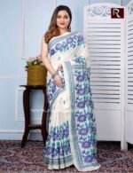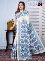 Kantha Stitch Work on Pure Tussar Silk Saree .The intricate kantha embroidery motifs on the plush silk texture with charming color redefine the beauty of this saree. This is another gem from the trove of Rapurna’s collection. This ethnic handicraft from Shantiniketan is another creative finesse of Bengal.