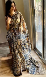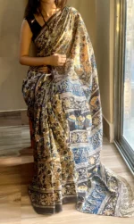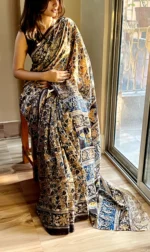 Off-White Silk Cotton Kalamkari Saree with colorful flowers and butterflies motif. This beautiful Saree is perfect as Summer wear! The fabric is a mix of Silk and Cotton offering best of both worlds!
